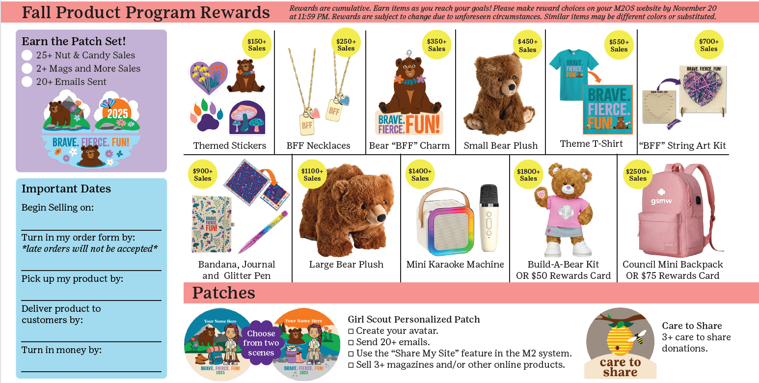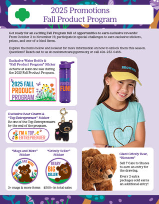 The Fall Financial Literacy Program is one of two council sponsored programs that combine educational activities with money earning opportunities. Girls ask friends and family to support them by purchasing magazines, nuts, candy and more.