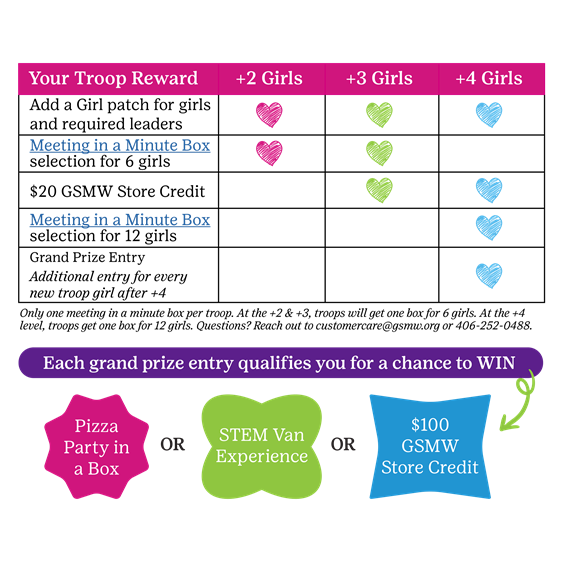 When you Add a Girl between now and January 31st, collect rewards! Keep track of girls added to your troop to self-report by February 28th with rewards delivered end of March. And every girl in your troop will receive a special patch!
